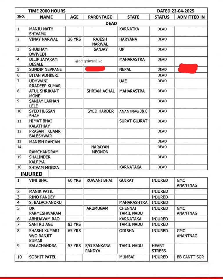 सो आतंकी हमलामा नेपालका संदीप न्यौपाने र वितन अधिकारीसहित २० बढी पर्यटकको हत्या गरिएको छ । कैर्यौँ जना घाईते समेत भएका छन् । नामावली हेर्नुहोस्