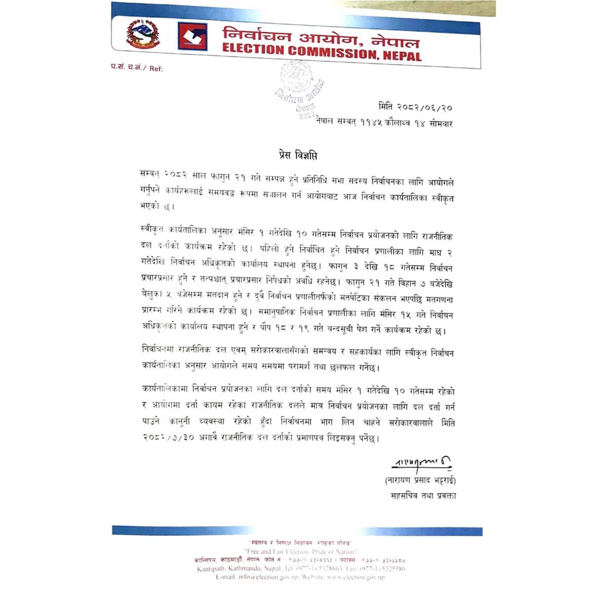 निर्वाचनमा भाग लिन चाहने सरोकारवालाले कात्तिक ३० अगावै राजनीतिक दल दर्ताको प्रमाणपत्र लिइसक्नु पर्नेछ आयोगद्वारा जारी विज्ञप्तिमा छ ।