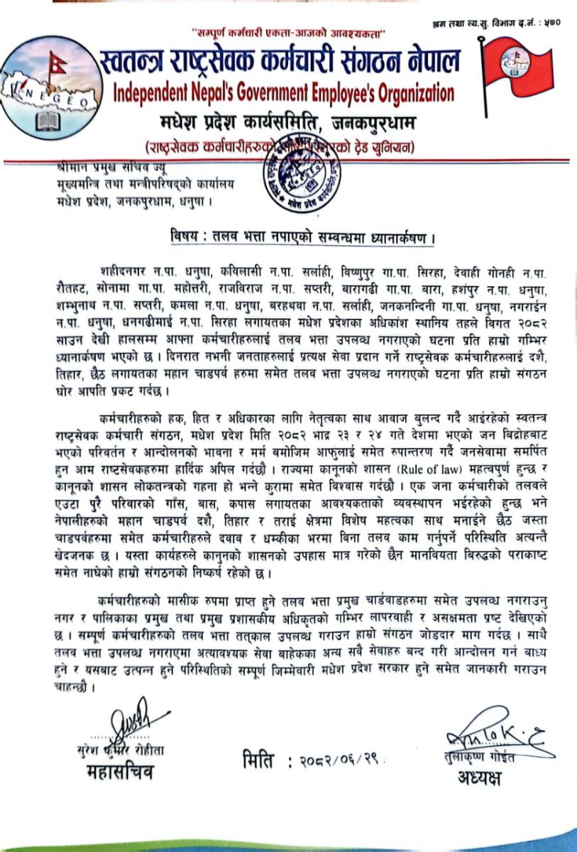 संगठनका अध्यक्ष तुलाकृष्ण गौतम र महासचिव सुरेश कुमार रोहिताद्वारा हस्ताक्षरित विज्ञप्तिमा शहीदनगर नगरपालिका, कविलासी नगरपालिका, बिष्णुपुर नगरपालिका, देवाही गोनही नगरपालिका, सोमना गाउँपालिका, राजविराज नगरपालिका, हंसपुर नगरपालिका, शम्भुनाथ नगरपालिका, कमला नगरपालिका, लगायतका स्थानीय तहमा कार्यरत कर्मचारीहरूलाई हालसम्म २०८२ साल साउन महिनाको तलव र भत्ता उपलब्ध नगराएको भन्दै ध्यानाकर्षण गराएका हुन् ।