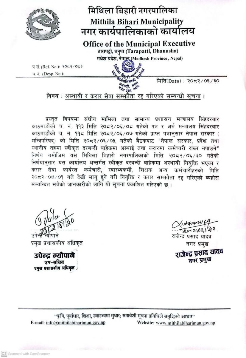 धनुषा जिल्लास्थित मिथिला विहारी नगरपालिकाले नगर क्षेत्रमा कार्यरत अस्थायी र करार सेवाका कर्मचारीहरूको नियुक्ति तथा सेवा सम्झौता रद्द गरेको हो।