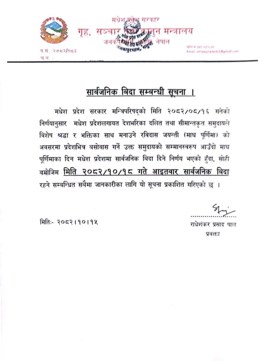 मधेश सरकार अन्तर्गतको गृह, सँचार तथा कानुन मन्त्रालयले जारी गरेको सूचनामा मधेश प्रदेशभित्र बसोबास गर्ने दलित, अल्पसँख्यक, सीमान्तकृत समुदायले मनाउने रविदास जयन्तीको अवसर पारेर एक दिन सार्वजनिक विदा दिएको हो ।