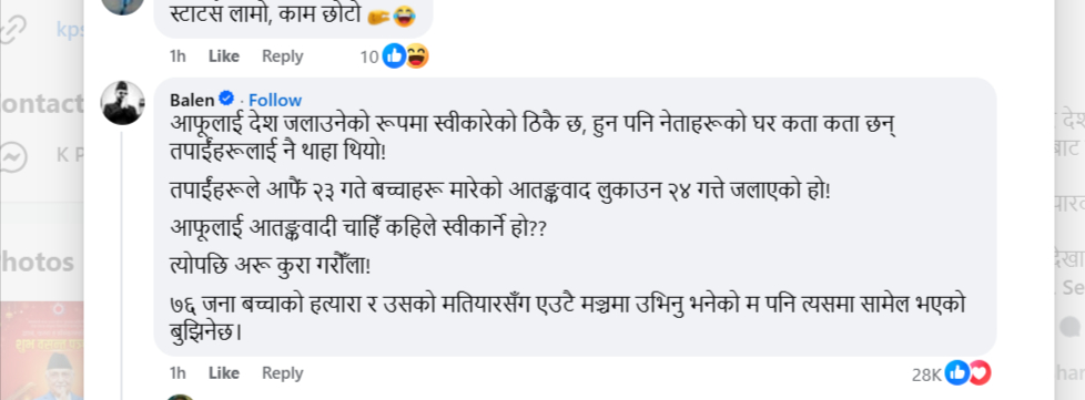 बालेनले आफ्नो टिप्पणीमा विगतका घटनालाई स्मरण गराउँदै ती घटनाको जिम्मेवारी स्वीकार नगरेसम्म बहस अस्वीकार्य हुने धारणा राखेका छन्। “७६ जना बालबालिकाको हत्या र त्यससँग जोडिएका गतिविधिबारे जवाफदेहिता नआएसम्म एउटै मञ्चमा उभिनु नैतिक रूपमा सम्भव छैन,” भन्ने भाव उनको प्रतिक्रियामा देखिन्छ।