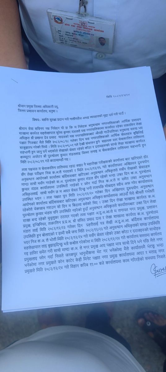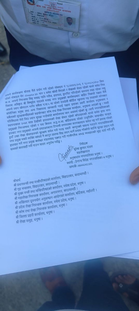तत्कालिन लेखा अधिकृत प्रशान्त देव यादवले गत पुस ९ गतेमै आफैले दर्ता चलानी गरी बरबुझारथ गरेको कागजात पाईएपछि कर्मचारीलाई झपारेको बताए । उनले लेखा अधिकृतलाई धनुषाधामबाट अन्यत्र जानको लागि कुनै सहमति नदिएको जनाउँदै बिना सहमति जाँदा सोधखोज गर्दा बरबुझारथ नभएको भन्दै आएका सुरेश मण्डलले नै बरबुझारथमा हस्ताक्षर गराएर कागजात गोप्य रुपमा चोरेर राखेको प्रमाण भेटेपछि कडा शब्दमा मात्र झपारेको बताए ।