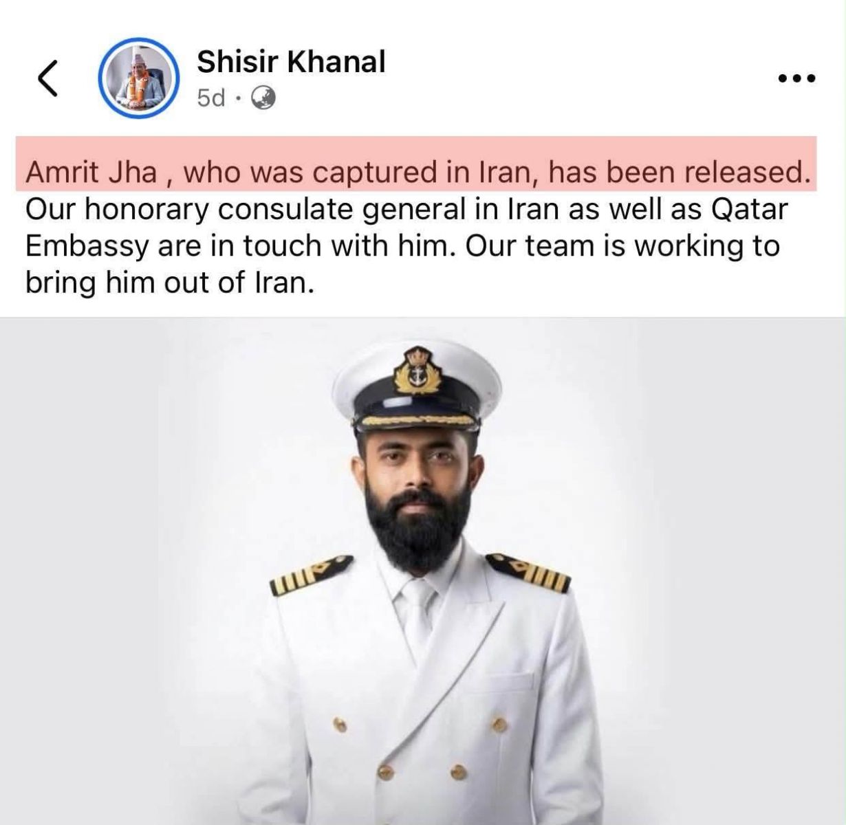 यूएईमा मुख्यालय रहेको ब्ल्याक सी मरीन एलएलसी नामक कम्पनीको स्वामित्वमा रहेको पानीजहाजको चालकदलका सदस्य रहेका उदयपुरको त्रियुगाका झा दुबईबाट तेल लिन इरानतिर गएका समयमा पक्राउ परेको विवरण आएका थिए।